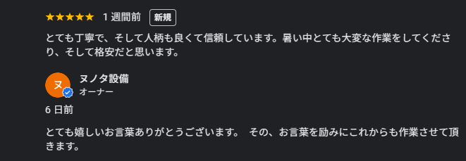 こんにちは!ヌノタ設備(布田設備)です。 先日、お客様から大変励みになる心温まるクチコミをいただきました。