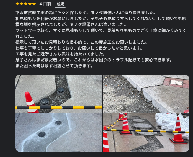先日、下水道接続工事をご依頼いただいたお客様から、非常に光栄な口コミを頂戴いたしましたのでご紹介させていただきます。