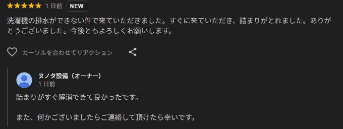 お客様からも「すぐに来ていただき、詰まりがとれました。ありがとうございました」と大変ありがたいお言葉をいただき、私共も安心いたしました。